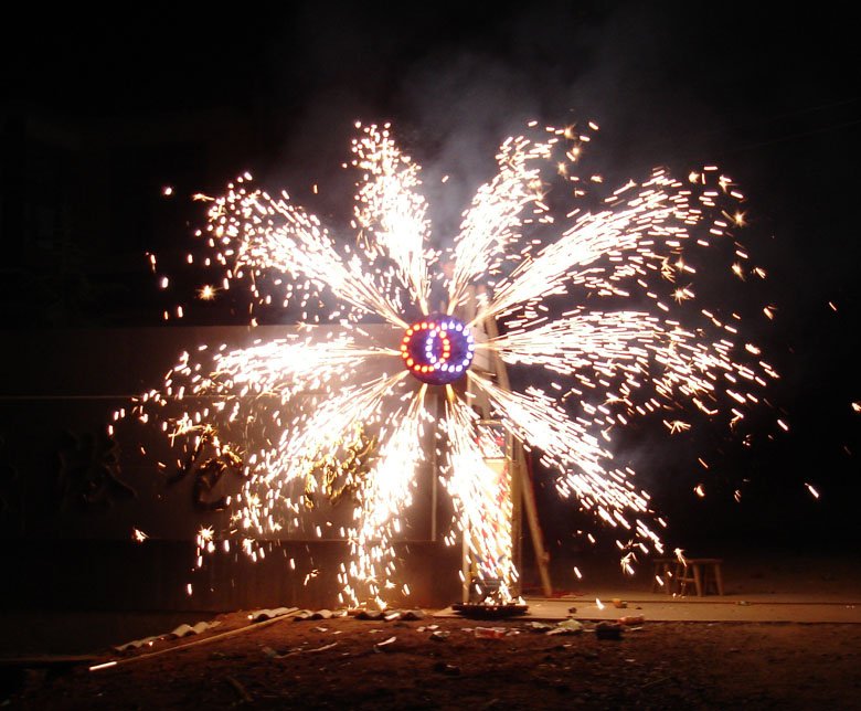 Такие фейерверки представляют собой «колеса» различных размеров, разбрасывающие искры при вращении. У летающих вариантов есть картонные крылышки, при помощи которых они поднимаются в воздух по принципу вертолета. Наземные образуют цветные круги искр в горизонтальной плоскости. Не стоит поджигать их на снегу или траве, где они просто не смогут двигаться; лучше выбрать ровную твердую поверхность.