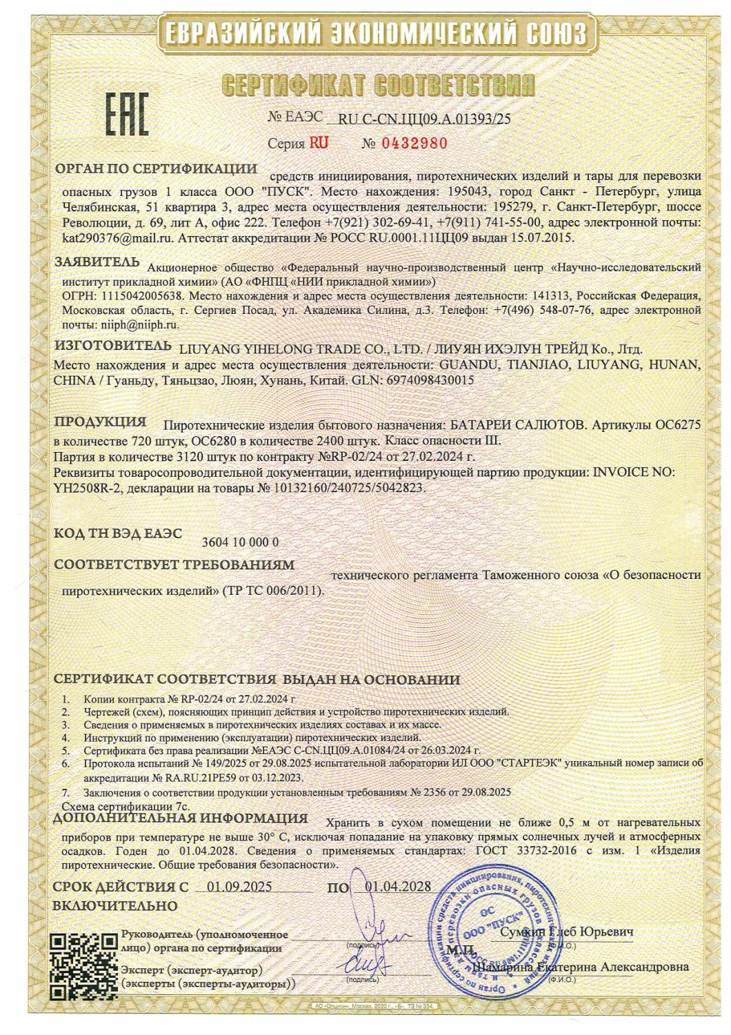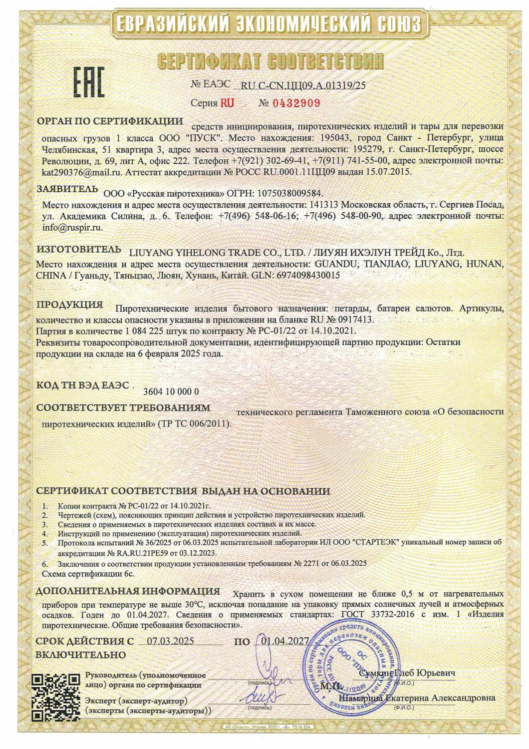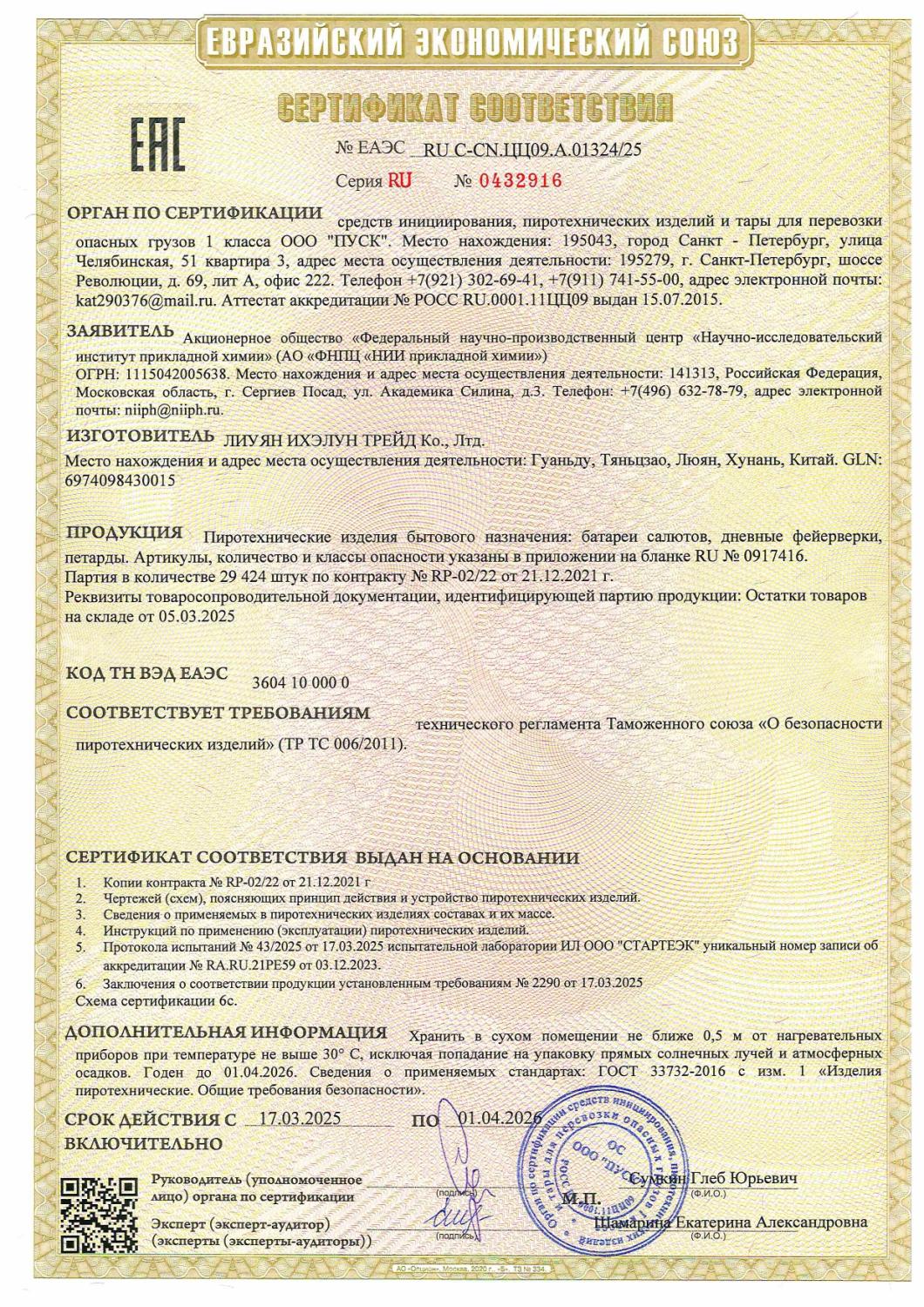 Вид деятельности – разработка, производство, испытание, хранение, реализация и утилизация боеприпасов (в том числе патронов к гражданскому и служебному оружию и составных частей патронов), пиротехнических изделий IV и V классов в соответствии с национальным стандартом, применение пиротехнических изделий и V классов в соответствии с техническим регламентом, в том числе по организации проведения фейерверков с использованием пиротехнических изделий...