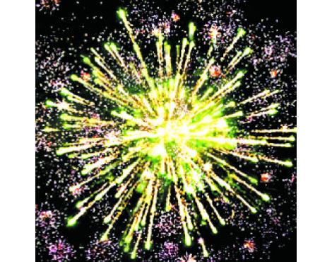 3. Зелено-фиолетовые звезды с пышными хвостами (кокос) и облако золотых трещащих разрывов (трещащий дождь).