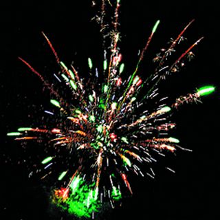 2. Зеленое мерцание и облако трещащих разрывов (трещащая хризантема). 3. Красные звезды с пышными хвостами (кокос) и красные звезды.