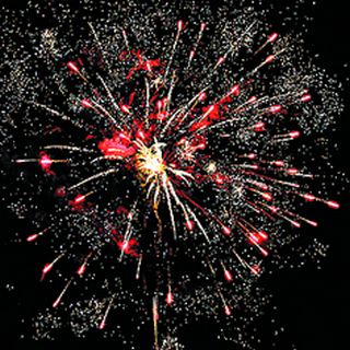 5. Красное мерцание и облако трещащих разрывов (трещащая хризантема). 6. Множество серебряных ниспадающих нитей (парча) и синие звезды.