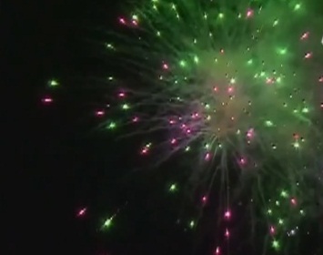 5. зеленых мерцающих огней, золотых форсов с трещащими разлетающимися искрами и красными огнями на концах;