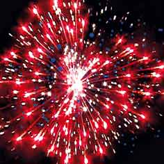 6. Красно-синяя сфера (пион) и серебряные звезды с пышными трещащими хвостами (трещащий кокос).
