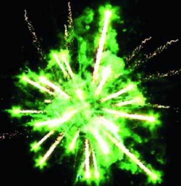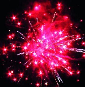 13. Искристая змейка, синяя сфера (пион) и облако трещащих разрывов (трещащий дождь).