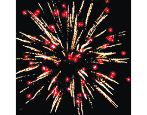 2. Красные звезды с пышными хвостами (кокос), зелено-белая мерцающая сфера (пион) . (до 25 м)