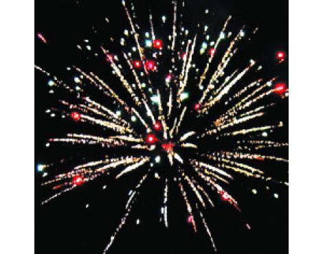4. Множество серебряных ниспадающих нитей (парча), зеленая сфера (пион) и облако треска (трещащий дождь).